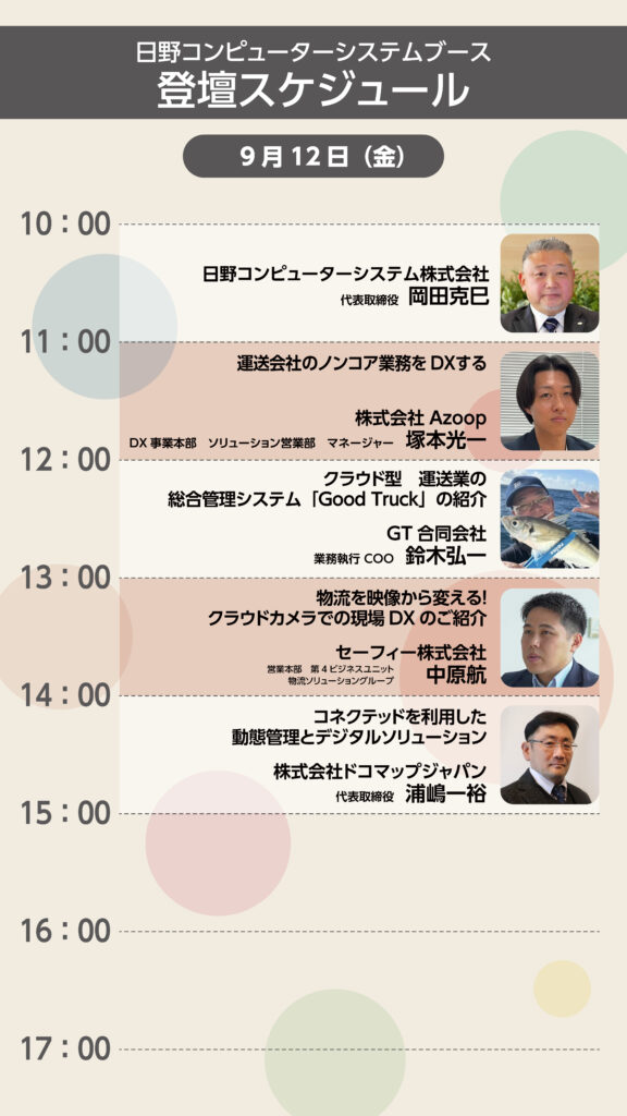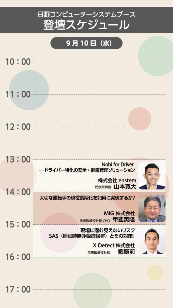 主な展示内容は、安全運行支援、ドライバー健康支援、自動点呼システム、デジタル点検管理など、多岐にわたる物流現場の課題解決に向けたソリューションを一堂にご覧いただけます。